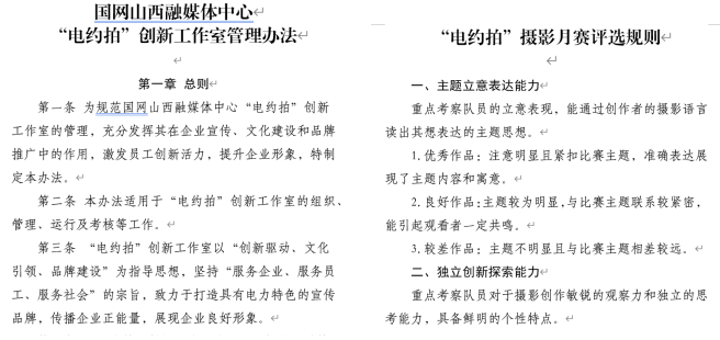 制定《“電約拍”創(chuàng)新工作室管理辦法》《2024年“師帶徒 青藍計劃”新聞采訪實訓方案》《圖片資源管理系統(tǒng)管理辦法》《“電約拍”團隊積分獎勵辦法》《爭創(chuàng)“七個最”宣傳成果工作方案》《“為美好生活充電 為美麗中國賦能”攝影月賽評選規(guī)則》《“電約拍”采風承諾書》等相關制度,通過完善的管理機制和制度,推進了項目規(guī)范化運營、標準化管理。加強團隊文化建設,“電約拍——佳片有約”團隊師徒8人,通過附加“葫蘆家族”情愫,打造出“記錄時代、匠心傳承”的團隊文化。
