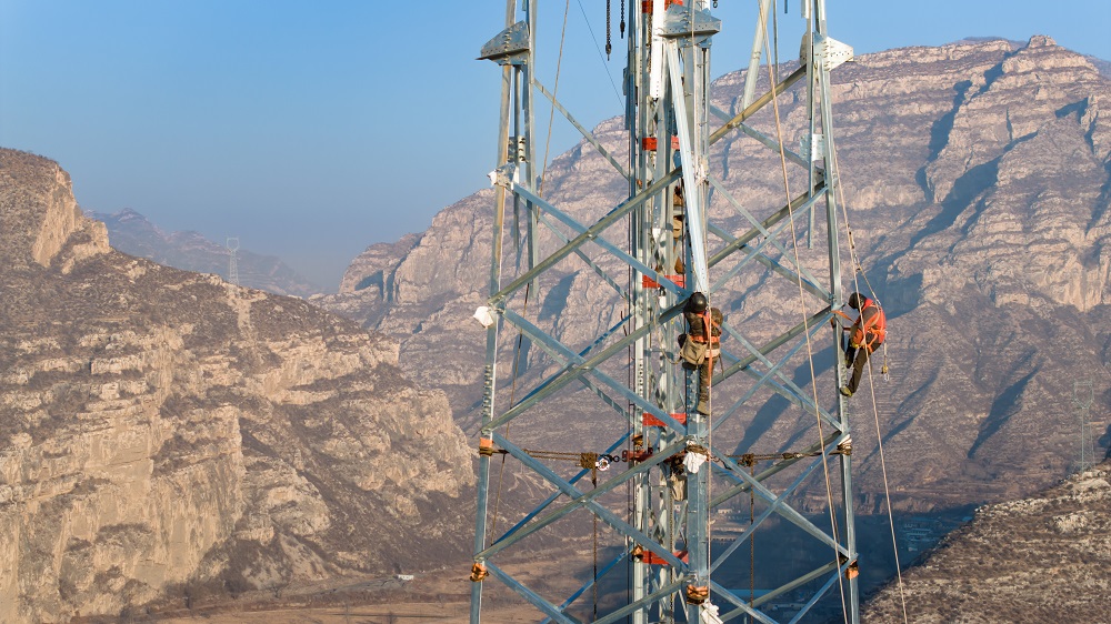 1月1日,國網(wǎng)山西送變電公司施工人員堅(jiān)守施工現(xiàn)場,在500千伏忻州北-陽泉線路工程開展落地雙搖臂抱桿組塔作業(yè)。